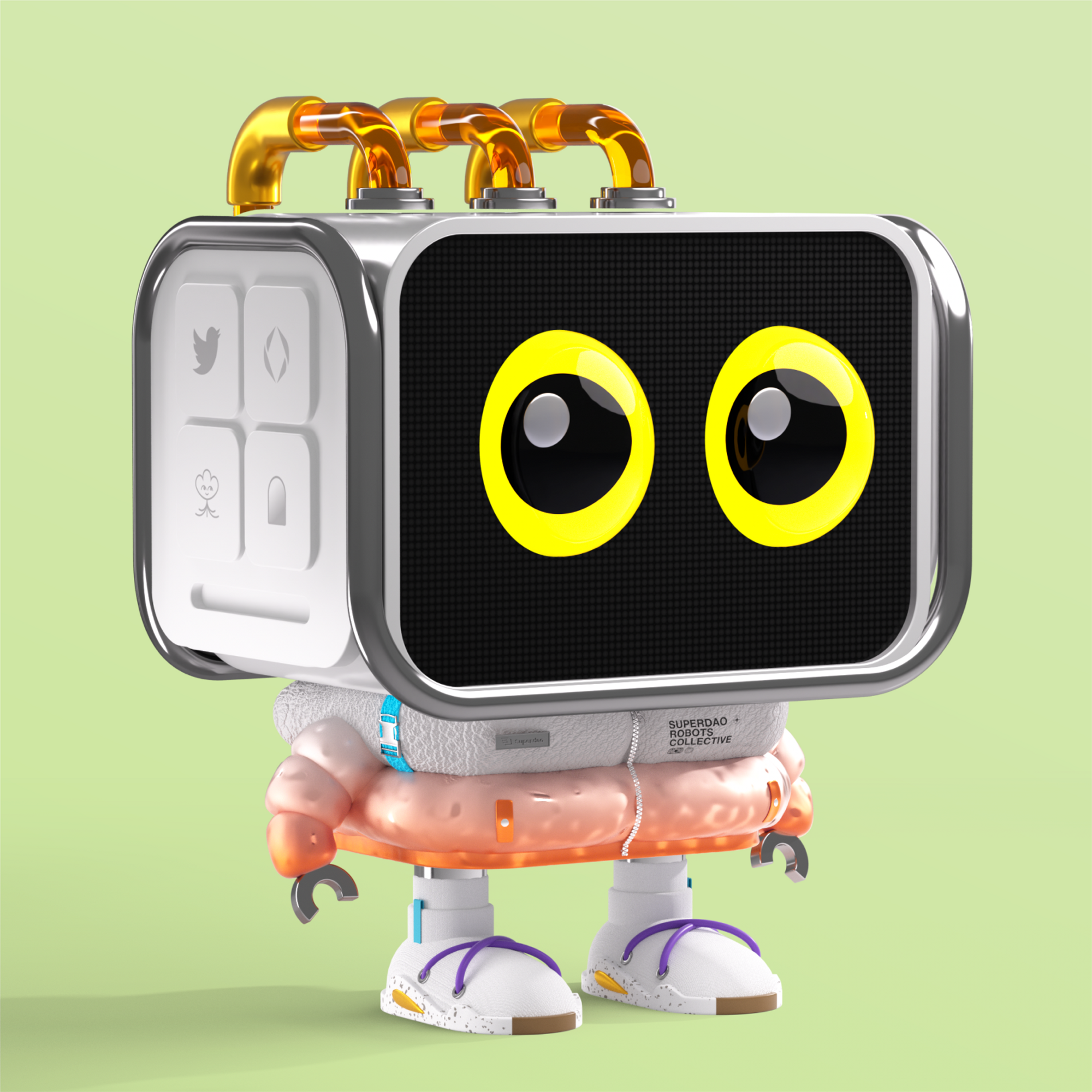 Super Robots is an evolving collection of randomly generated 3D bots that reflects your wallet history, personal vibe, and preferences.
